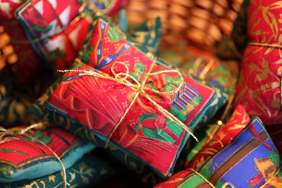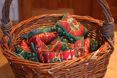 Varrtam egy kosárravaló “karácsonyi illatot”. Két különböző méretű párnácskát arany nyinórral kötöttem össze, és kaptak egy kicsit a “karácsonyi illat” illóolajból. Bekötöttem őket egy zacskóba, hogy az illat mindenhol jól átjárja a párnácskákat.
