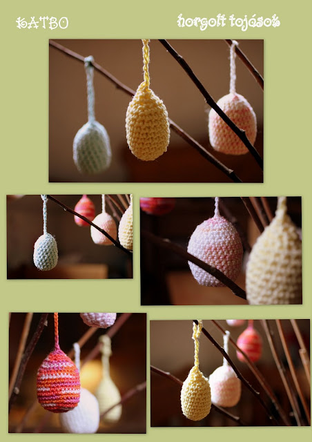 Bodza Beánál megláttam a horholt tojásait, és én is kedvet kaptam hozzá. A teljesen érthető leírást pontosan betartva is ilyen összevisszák lettek. Nincs köztük két egyforma, van amelyik inkább füge, mint tojás. Húsvétig még többet szeretnék meghorgolni, mert szívesen ajándékoznék ilyet a családban a felnőtteknek, de még az is lehet, hogy egy-két arra érdemes férfiember ilyen tojást kap a hétfői locsolásért.
