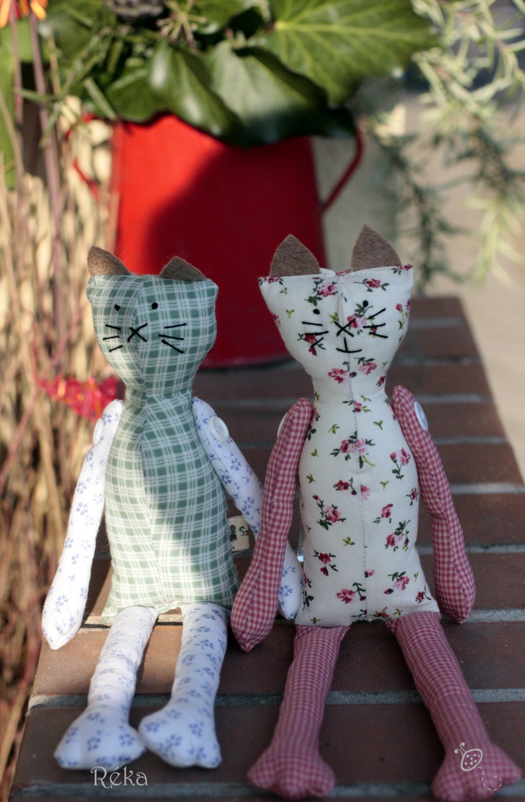Viszont az elmúlt hetekben a kezünkbe került, Zsófi felültette a polcára, én pedig nagy meghatottságomban gyorsan varrtam két macskát. Nem tagadom, hogy a mostanában oly divatosnak számító “vegyes színhasználat” engem is megfertőzött, pedig igen konzervatívnak tartom magam. 🙂