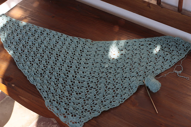Azt hittem, mire hazaérünk elkészülök a kendőmmel, de úgylátszik lassabban horgolok, mint ahogy gondoltam.