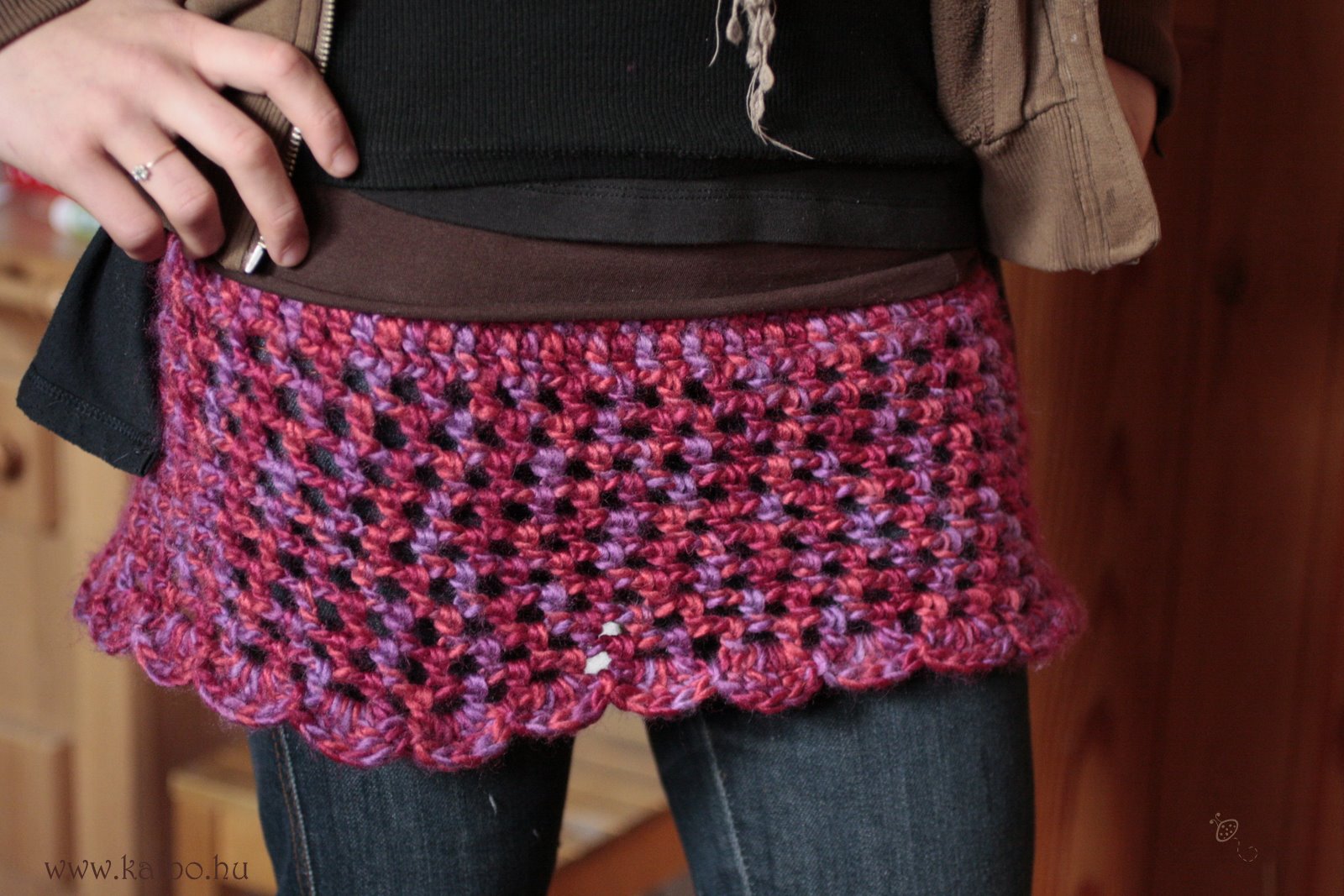 Zsófinak horgoltam ezt a szoknya szerű ruhadarabot. Nadrág nélkül nem nagyon hordható :-), de tervezek, vagyis Ő nem hagy békén, hogy készüljön majd egy olyan is, ami alatt anyag van.
