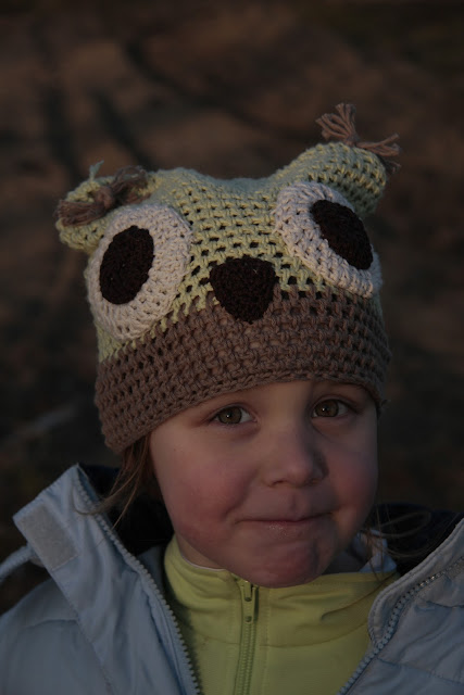 Körbehorgolással készítettem egy téglalapot, a két felső sarkába behúztam néhány fonalat bojtnak, lett két szeme és egy csőre.