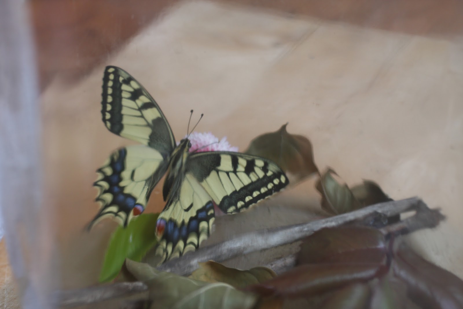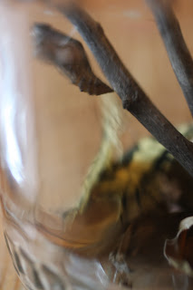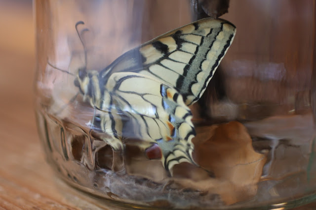 Gondoltam gyorsan lefényképezem még az üvegben mielőtt elpusztul, de már nem találtam. Persze, mert én egy zöld hernyót kerestem, miközben ő aznap reggelre már bebábozódott, téli álmát alvó pillangó bábjává változott. (sajnos ezt a képet nem találom, pedig nagyon érdekes volt, ahogy két pókháló vékonyságú fonálon kikötötte a bábját a faághoz.)