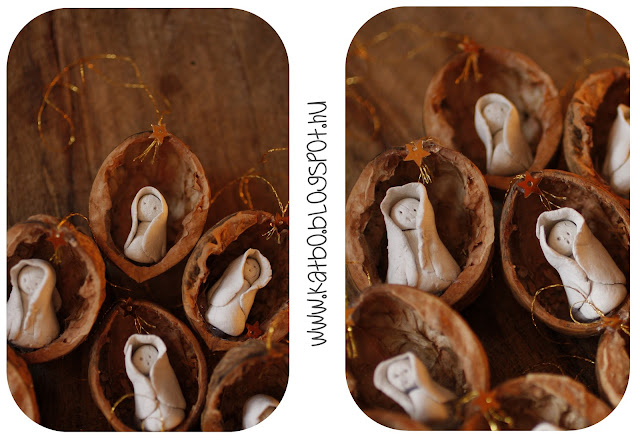 A hagyományos, iskolai Luca napi vásárra készítettem itthon a gyerekekkel dióhéj karácsonyfadíszeket. Az eredeti terv szerint az egész Szent Családot szerettük volna belerakni. Gondoltam, hogy egy Alsószentiváni dió héjába ez gyerekjáték lesz.