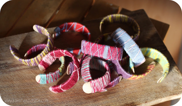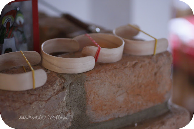 Színes fonallal, (talán valamiféle makraméfonal?) díszítették a gyerekek, merthogy Zsófiék osztályába járó lányokkal készítettük ezeket a karpereceket a múltheti Luca napi vásárra.