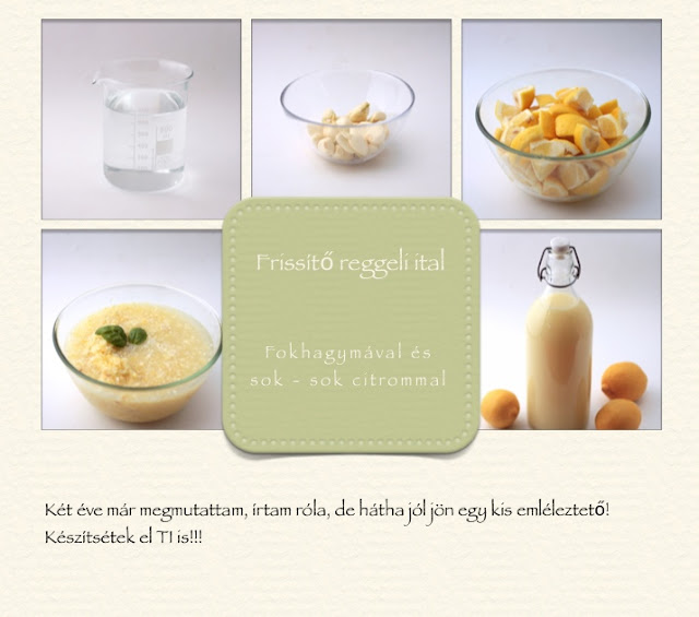 Elkészítés: A fokhagymát lehéjazzuk, aprítjuk. A citromot a héjával együtt apróra vágjuk, mixerben összeelegyítjük a fokhagymával együtt, majd egy liter vízzel a főzőlapra (tűzhely) helyezzük.