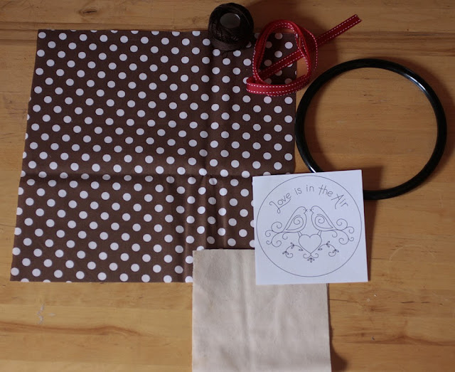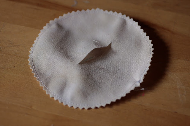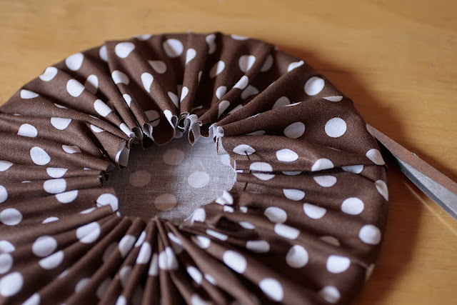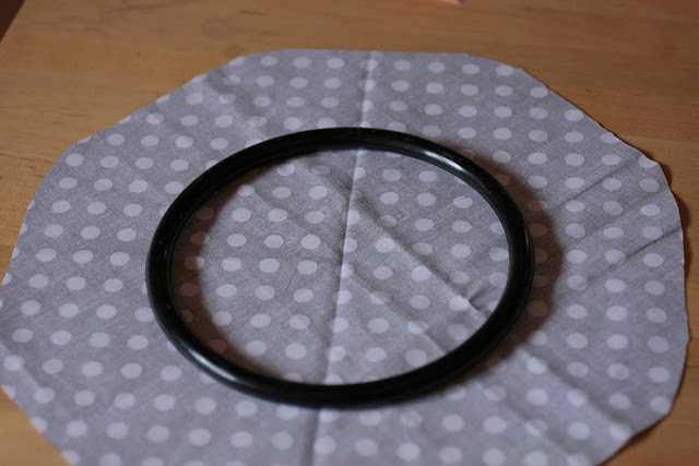 Ennek a kapott körnek a közepére helyezzük a karikát, és egy erős cérnával behúzzuk a karikát az anyaggal.