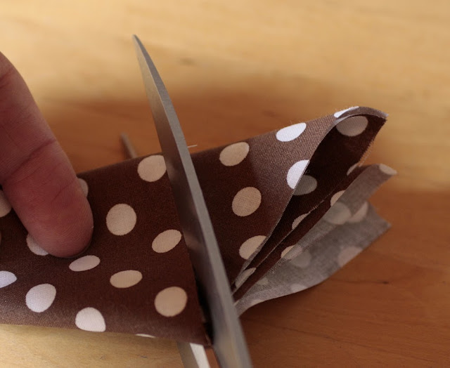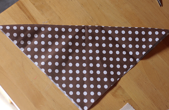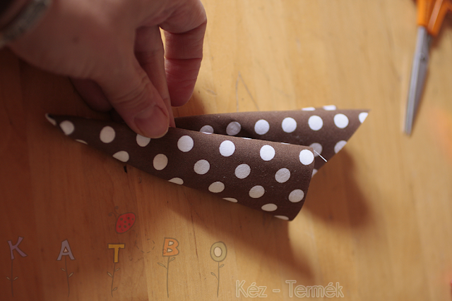 A mintás anyagot átlójában addig hajtogatjuk, míg egy keskeny háromszöget kapunk, aminek lapjai már nem fedik egymást.