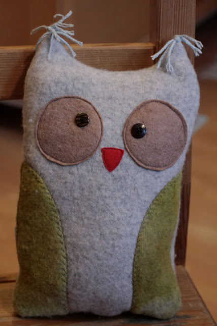 Mindkét párna filcesített gyapjúpulcsiból készült. A bagoly szárnya is ugyanaz a szürke pulcsi, csak zöld festékben úszkált egy röpke ideig.