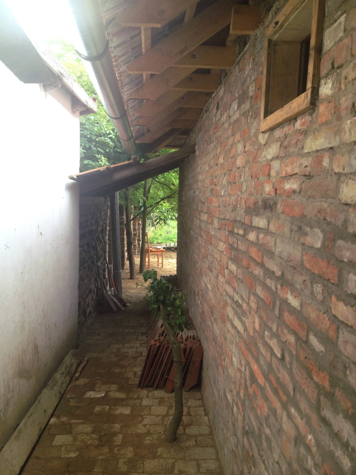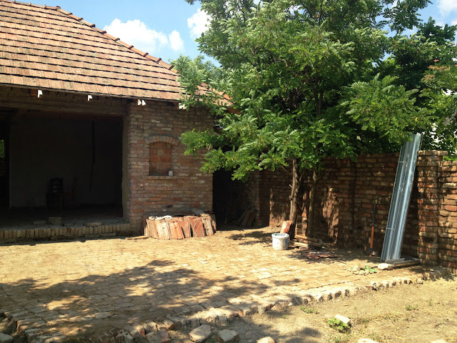 Adott volt egy vastag betonplacc, ez lett bontott téglával burkolva.