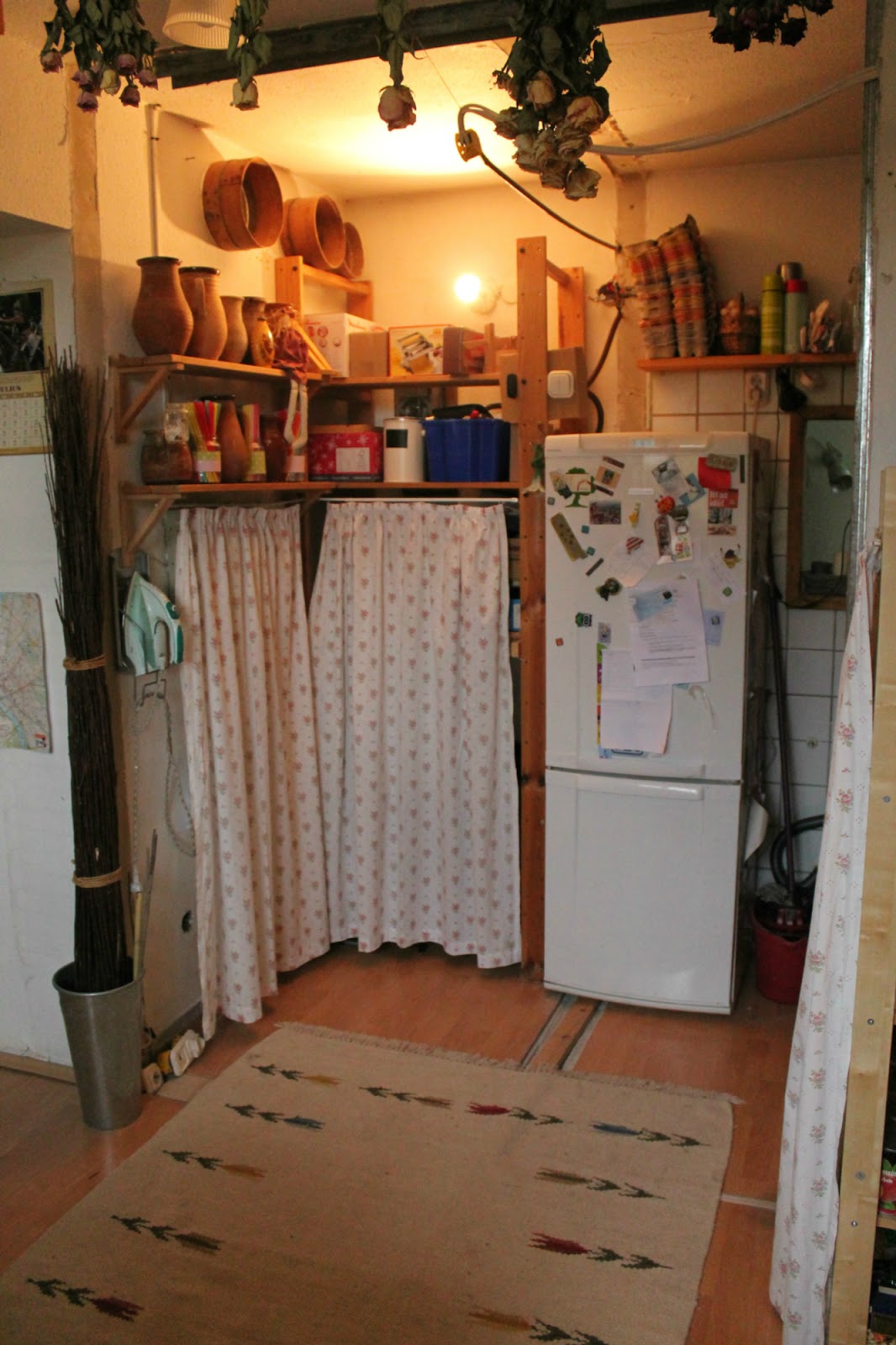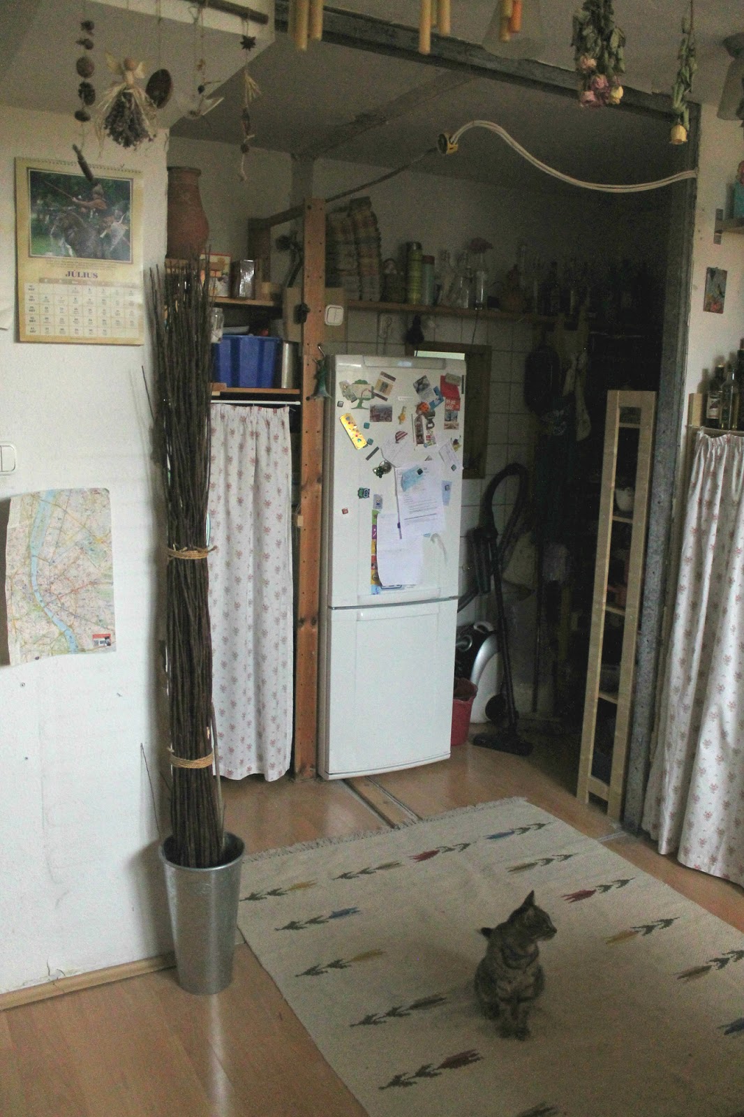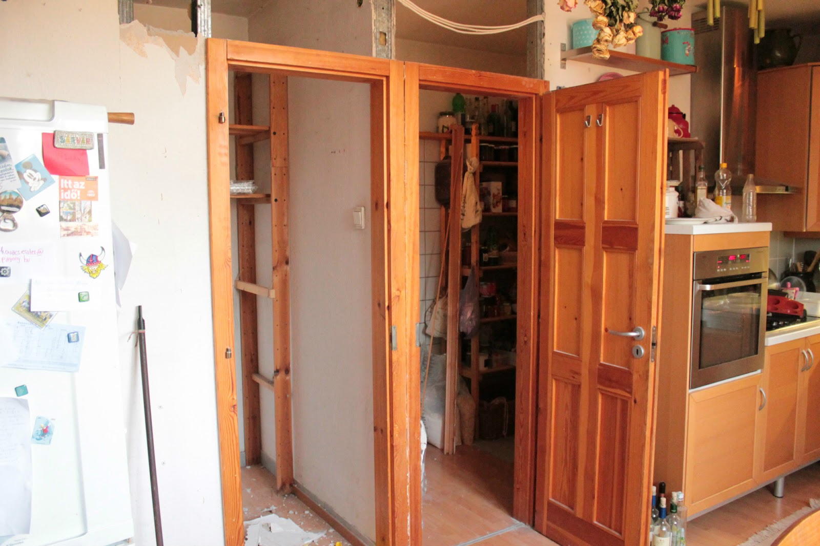 Tehát a következő lépés az új konyhapult, ami majd itt lesz a képen látható polcok, és hűtő helyén, de addig nekem még a műhelyemet kell gatyába ráznom annyira, hogy oda átmenetileg egy csomó mindent le tudjak cipelni, viszont ahhoz az kell, hogy a műhelyem megszabaduljon bizonyos nem odaillő gépektől, ami viszont nem rajtam múlik.