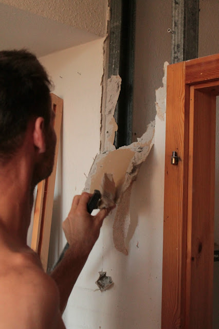 A gipszkartonfal egy részének a kiszedése.