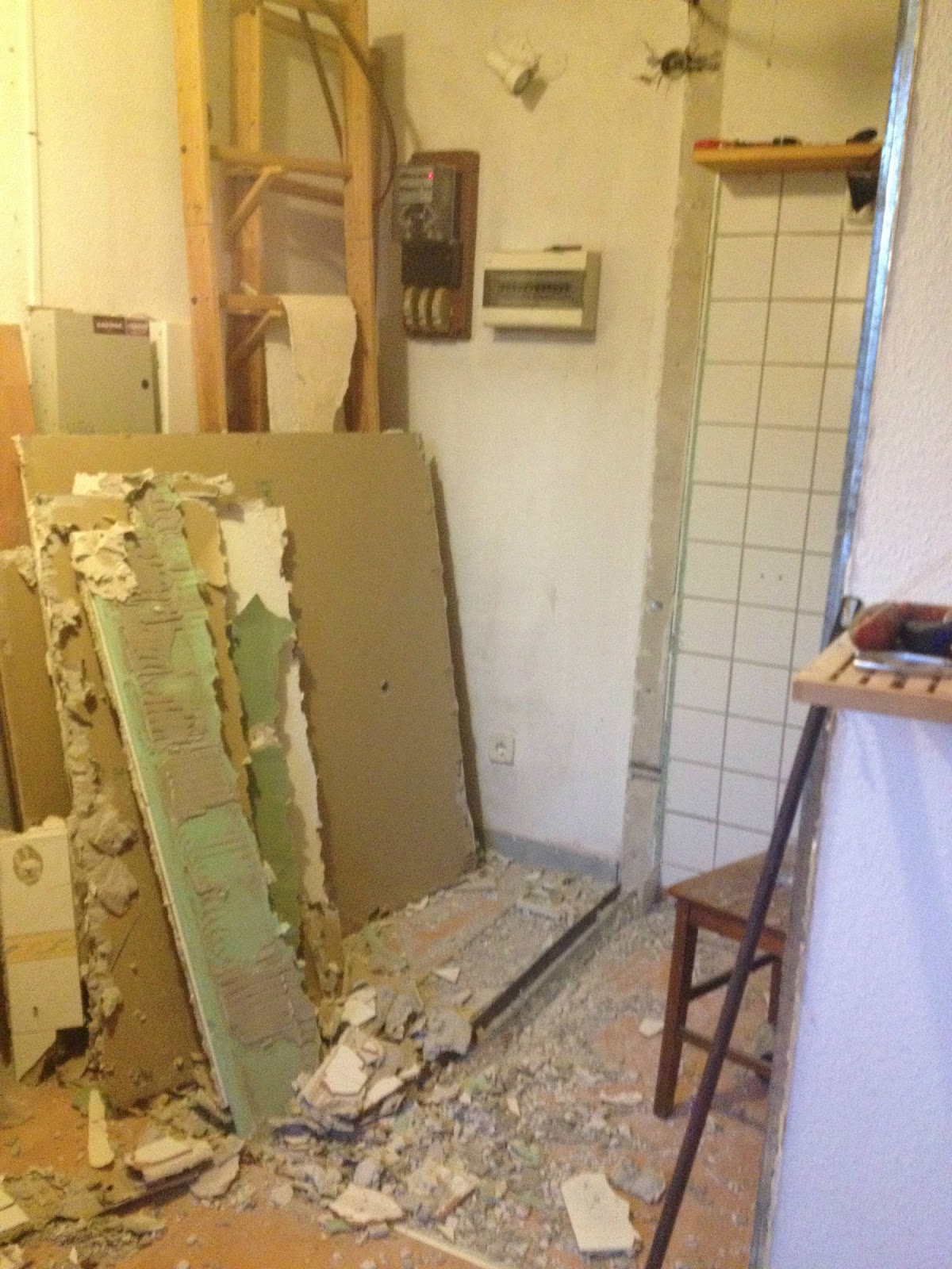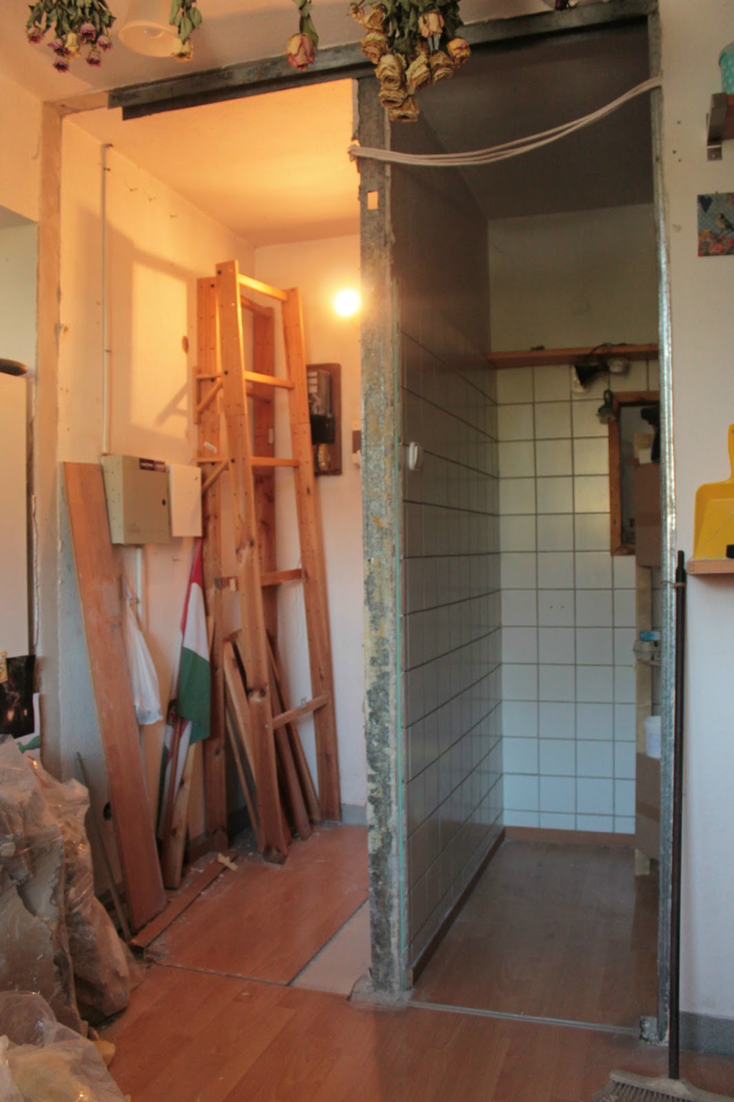 A mosókonyha felőli falon dupla csempe és dupla gipszkartonfal mutatja a 2002-es átalakítást.