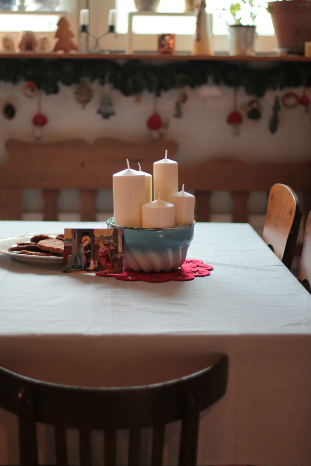 Az asztalra kaptam egy szürkéskék lepedőt a Jysk-ben, amire egy piros alátét és a régi kék fém kuglófformám került.