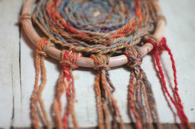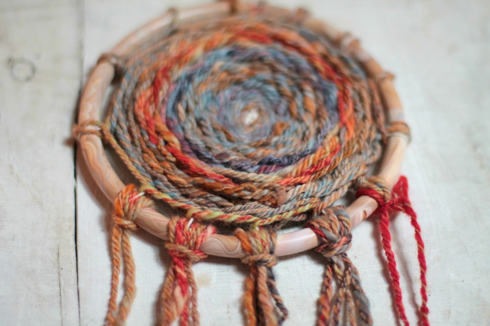 Az álomfogó keretéhez a táskafül karikáinból választottam egy olyan színt, ami szerintem passzol a fonal színéhez.
