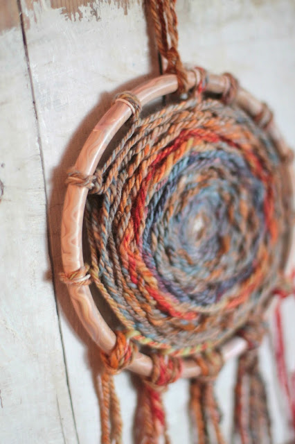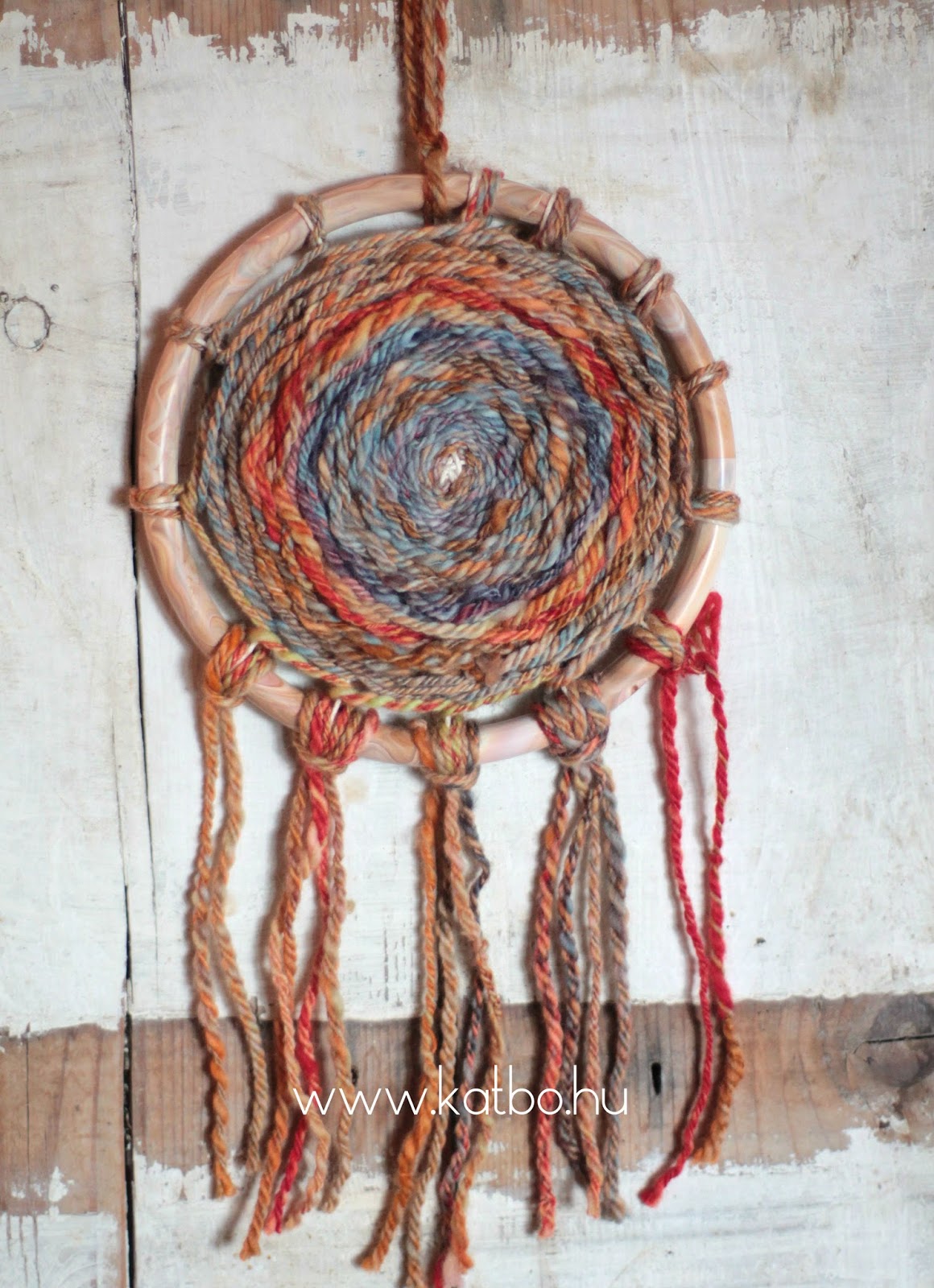 A fonal rusztikus textúrája, és intenzív színe miatt szerintem ez az álomfogó nem igényelt más díszítő elemet.