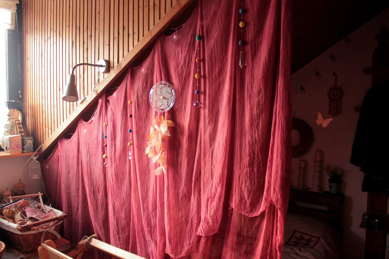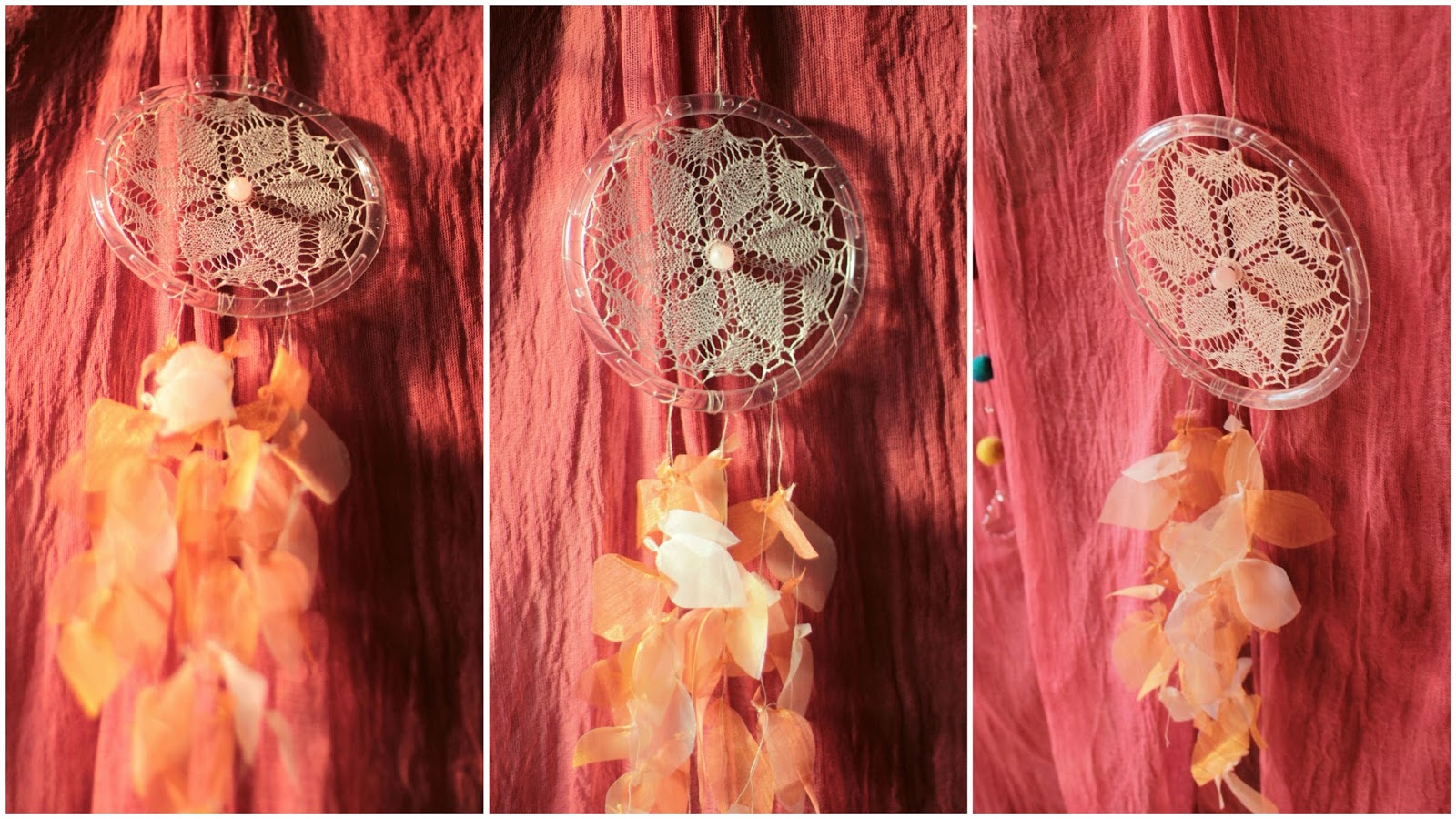 Botanikáéknál láttam egy álomfogót, amit nagyon különlegesnek találtam amitt, hogy a tollak helyett organzából kivágott műtollak díszítették.