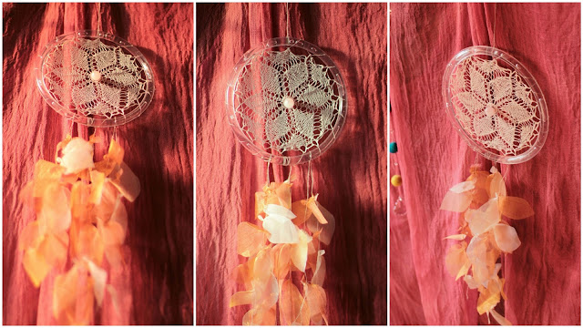 Ez ihlette az én álomfogómat is, amihez a műanyag karikánkat, egy ódon csipkét, amit egy vásár jótékonysági standjánál vettem, és egy rózsakvarc golyót használtam fel.