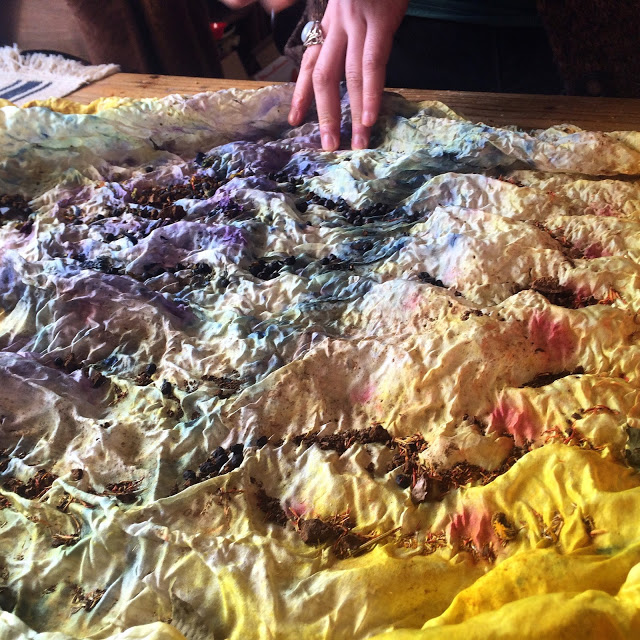 Panni lányom ecoprint selyemkendő festő workshopon vett részt, ami már régóta érdekel engem is, hiszen én is használom a festőnövényeket a fonalfestéseimhez.