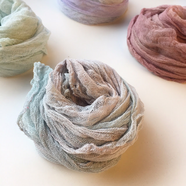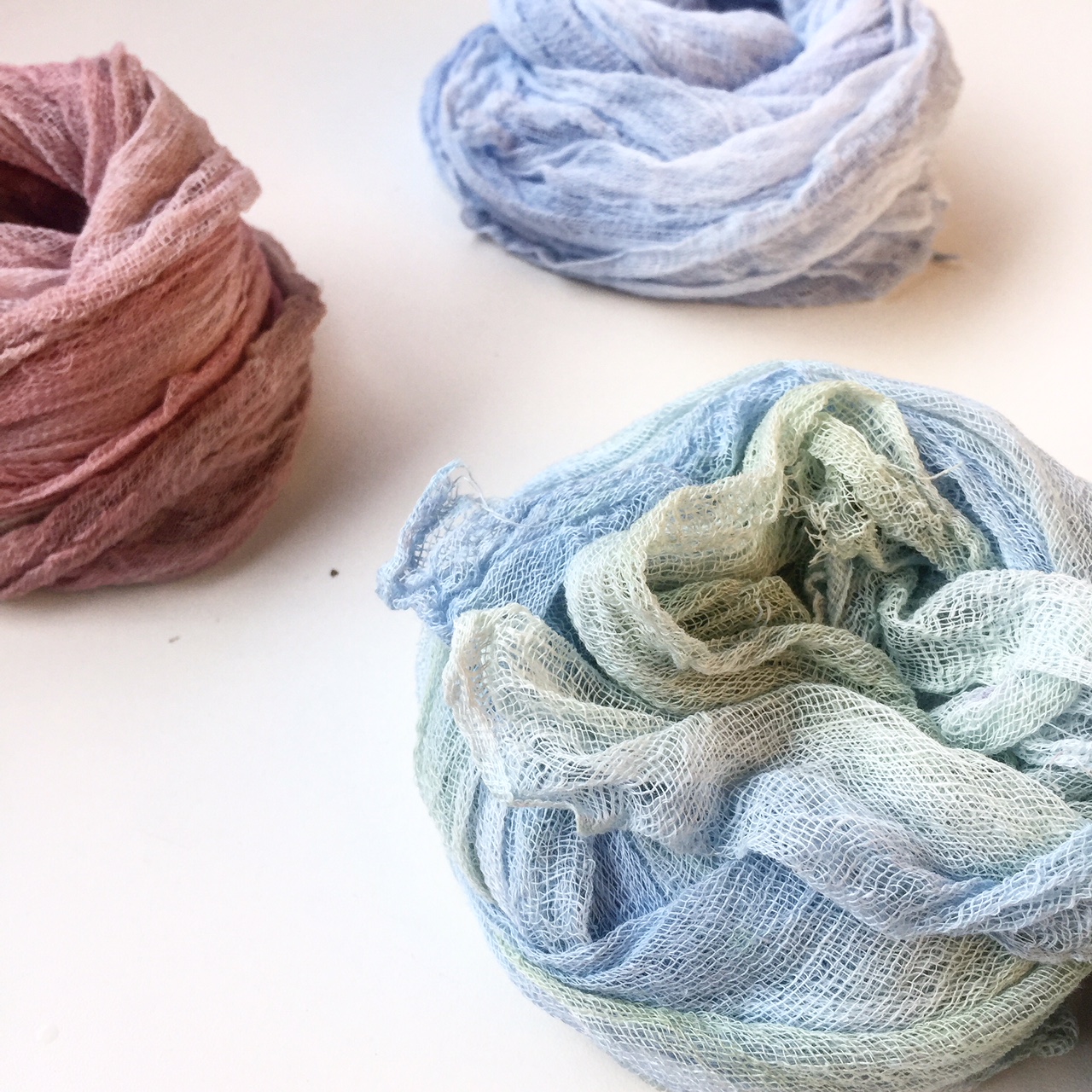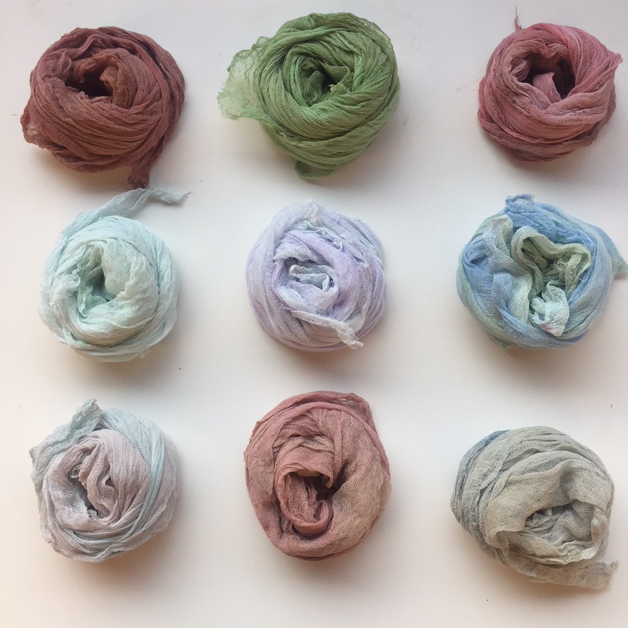 A legutóbbi festésem alkalmával ezeket a lágy, fakó színeket festettem a 120 x 90 cm-es gézkendőkre.