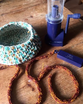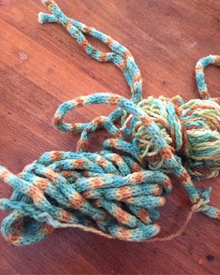 Úgy emlékszem, hogy tavaly festettem ezt a Dörögdi gyapjúfonalat – vagy tavaly előtt, és már arra sem emlékszem, hogy mire fogyott el a nagyrésze… lehet, hogy csak ezt a csövet kötöttem belőle? Mivel nem emlékszem másra, valószínű, hogy az egész gombolyagot felmalmoztam a kötőmalmommal.